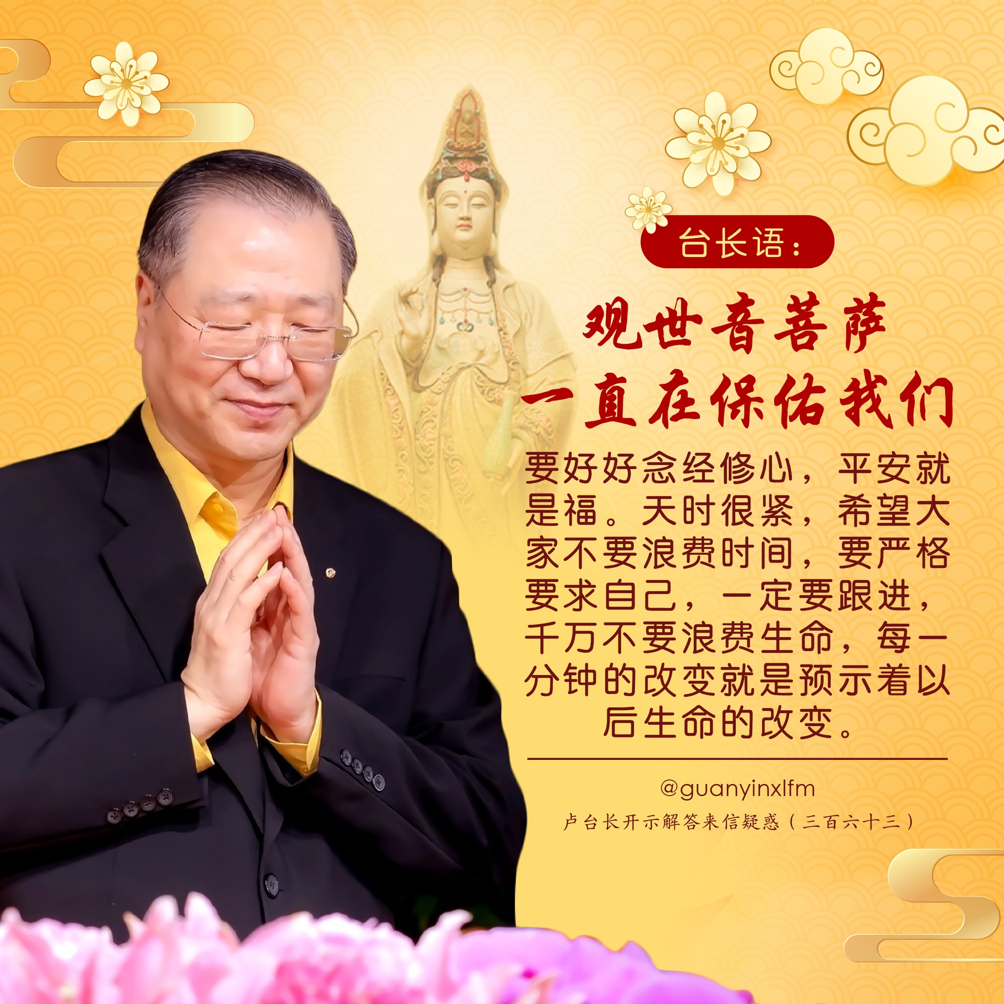 观世音菩萨一直在保佑我们。要好好念经修心,平安就是福。天时很紧,希望大家不要浪费时间,要严格要求自己,一定要跟进,千万不要浪费生命,每一分钟的改变就是预示着以后生命的改变。